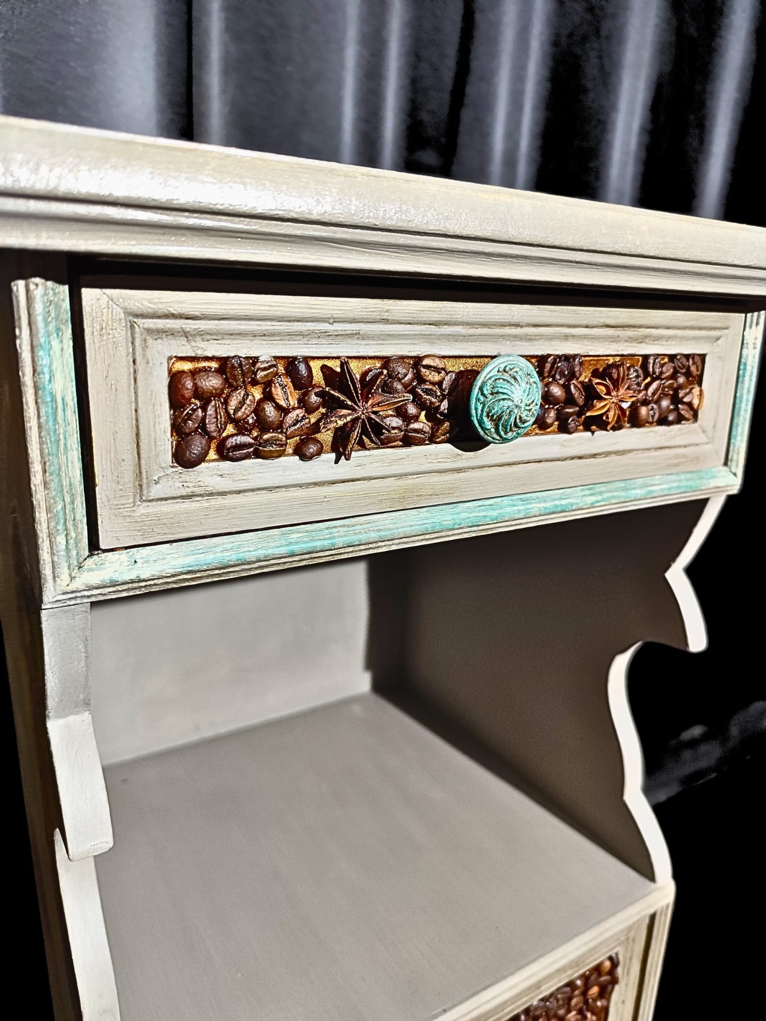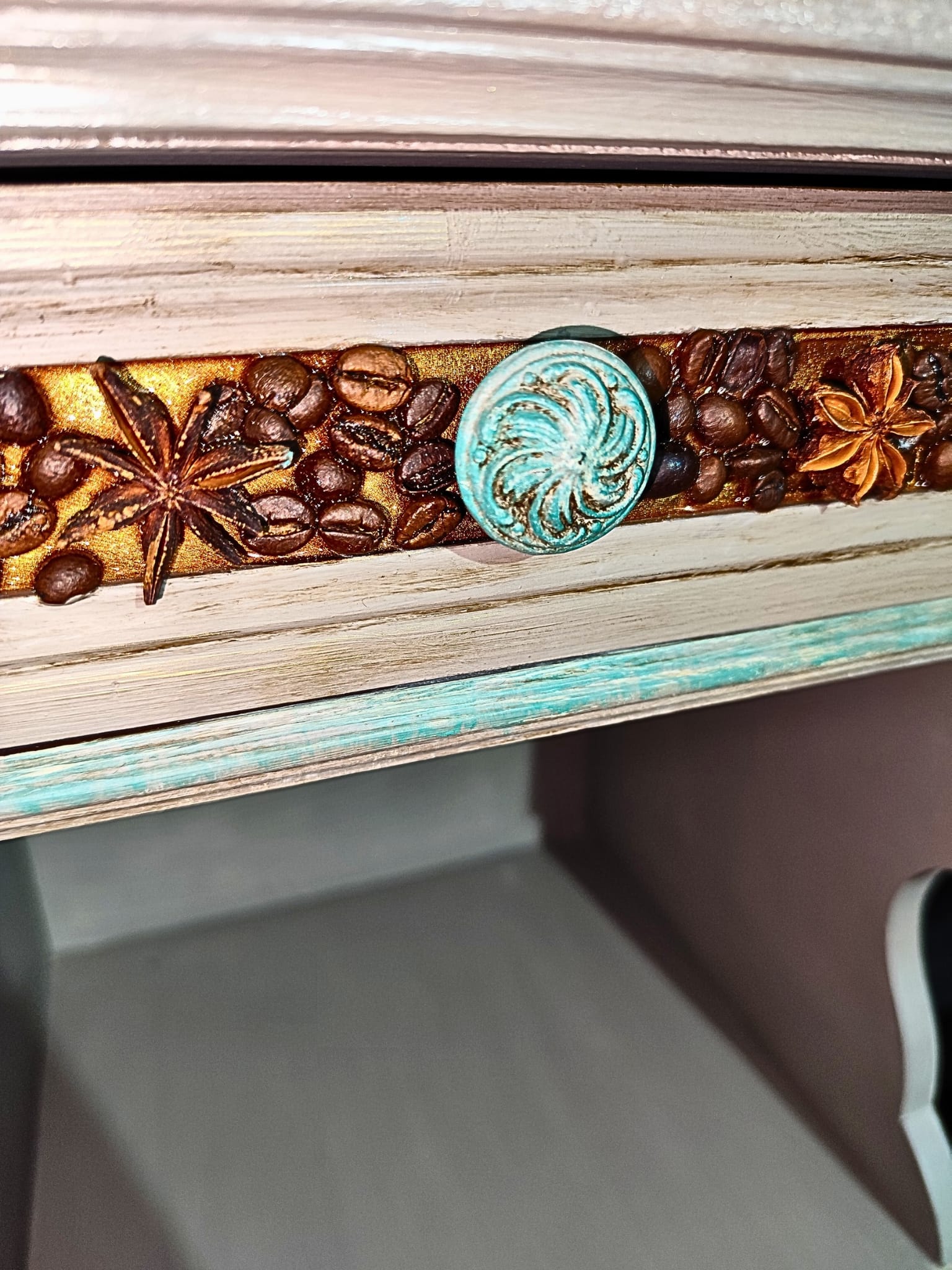Frontul ușii este acoperit cu boabe de cafea reale, adăugate în relief și încastrate în rășină epoxidică, pentru o experiență tactilă și vizuală surprinzătoare. În centru, un mic panou decorativ integrat cu motive tribale aduce culoare, ritm și energie, completând perfect textura caldă a cafelei.
