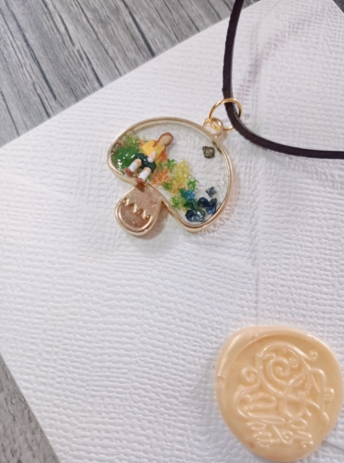 Un colț de liniște purtat la gât - „Fată la râu” este un pandantiv delicat, turnat manual din rășină epoxidică într-o bază metalică în formă de ciupercuță stilizată.