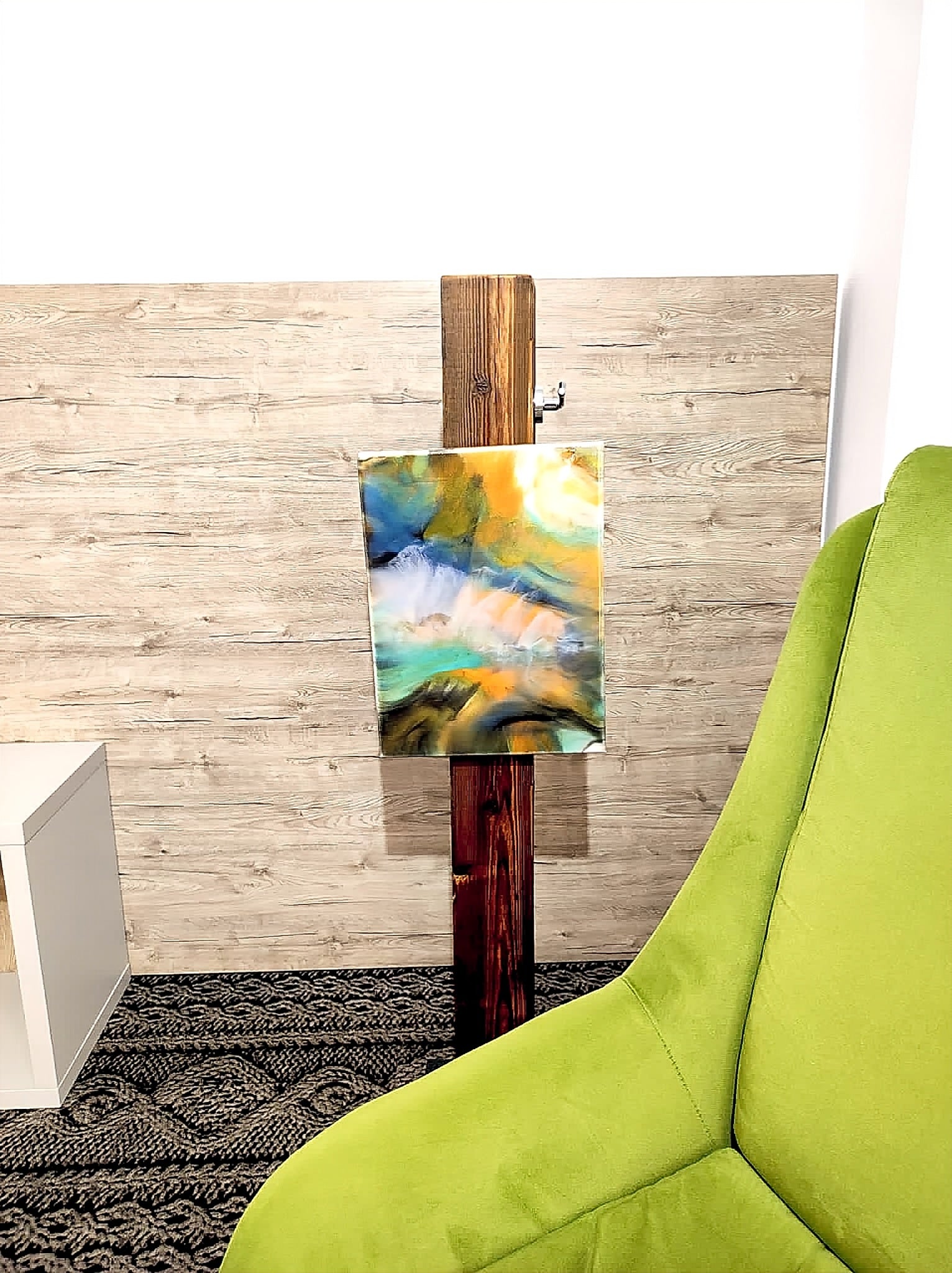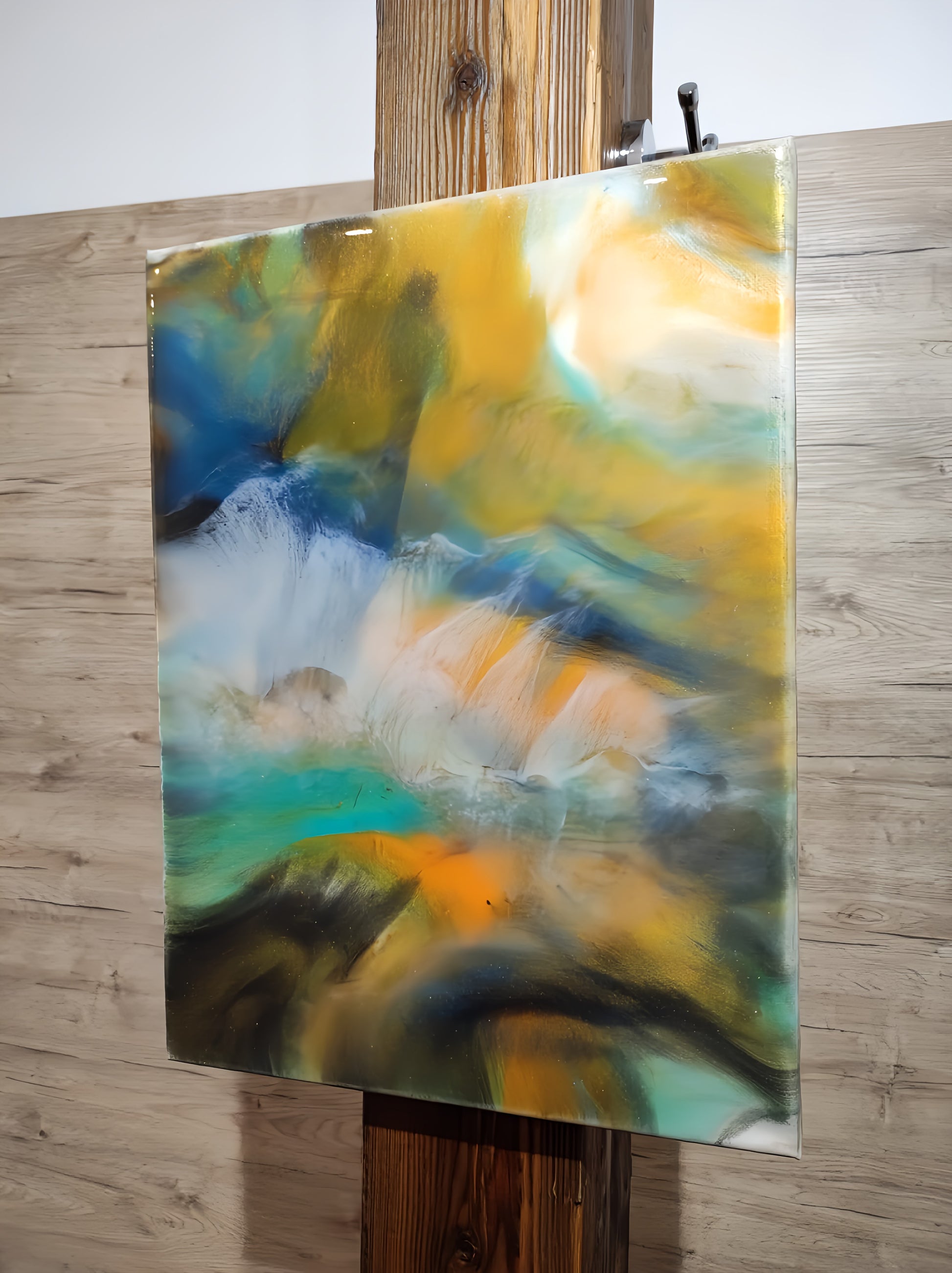 Este o lucrare abstractă, realizată din rășină epoxidică turnată în multiple straturi, care creează profunzime, volum și o senzație de mișcare vie - ca o furtună în plină desfășurare peste un peisaj deșertic.
