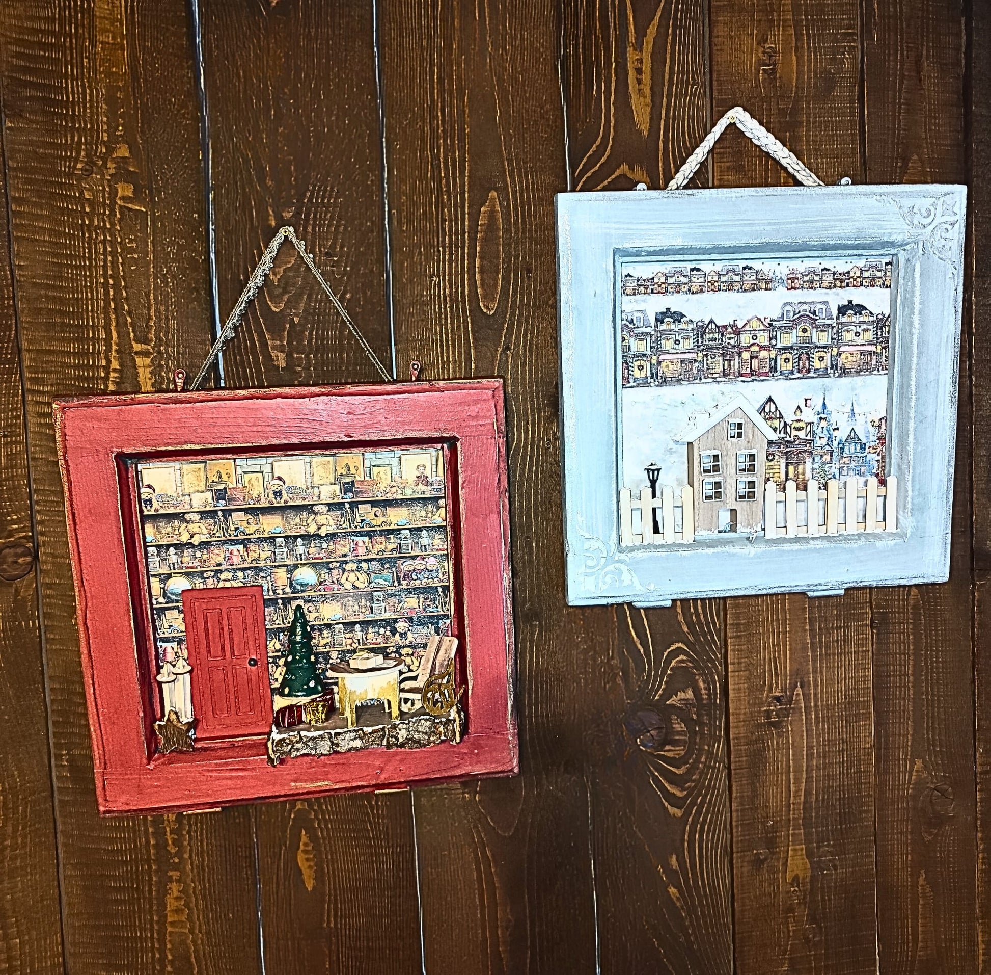 Descoperă un set unic de două ferestre-decor realizate manual în atelierul Korinos Boutique. Fiecare piesă recreează scene de iarnă în miniatură, cu elemente 3D, vopsea premium și detalii fine lucrate cu migală.
