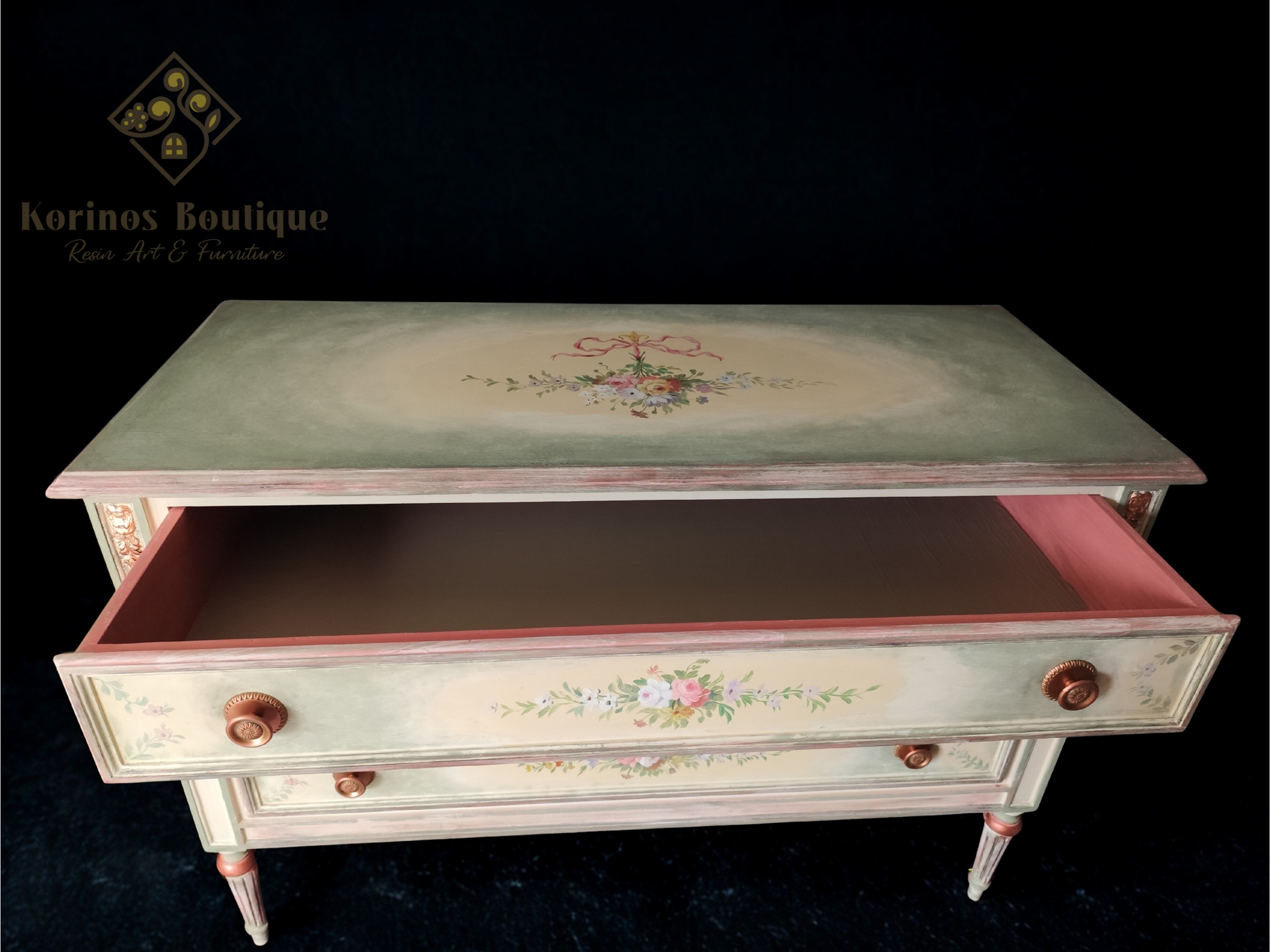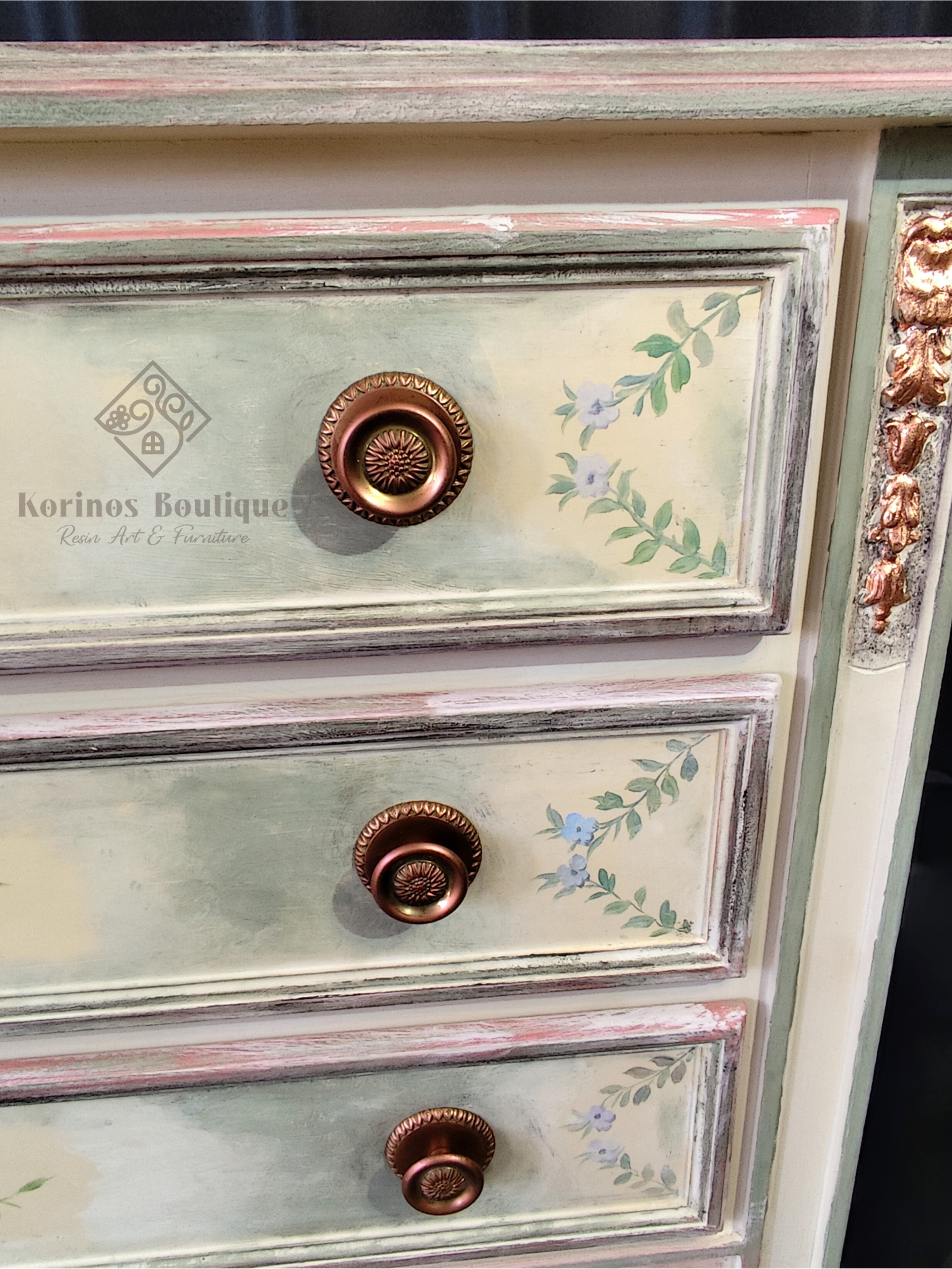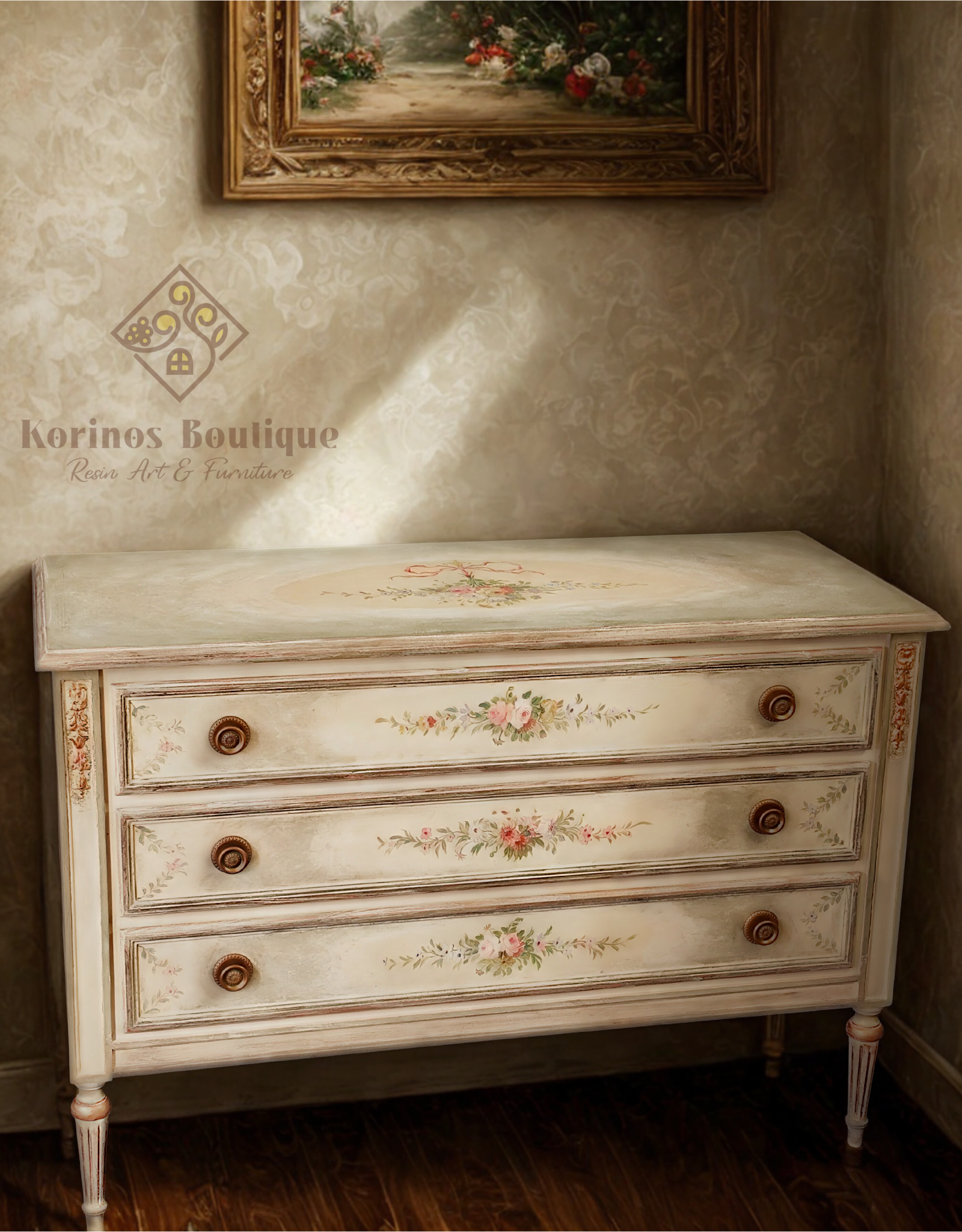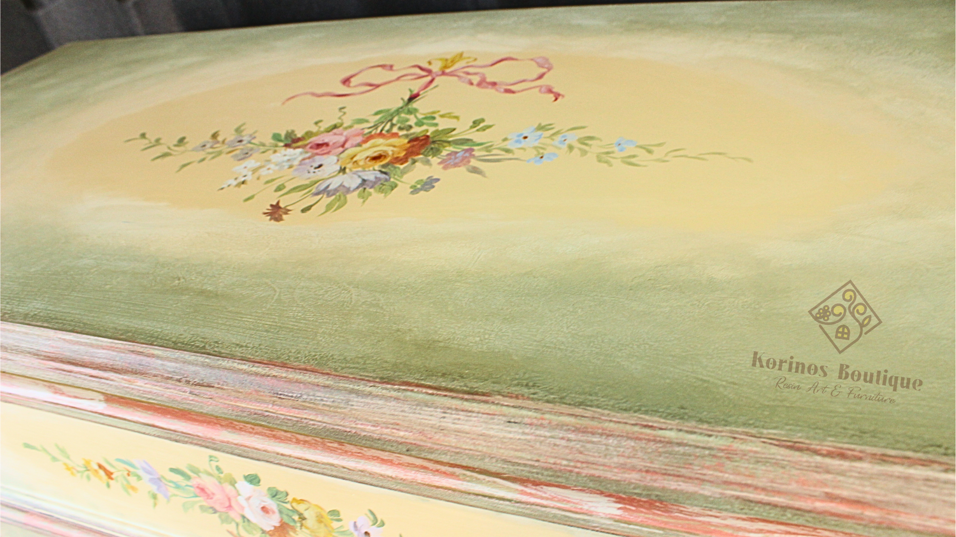 Am păstrat cu respect florile pictate manual, detaliu original care oferă fiecărei piese un farmec aparte și evidențiază măiestria artizanilor italieni. Contrastul subtil între patina modernă a vopselei și delicatețea picturilor originale transformă acest set într-o veritabilă operă de artă funcțională.