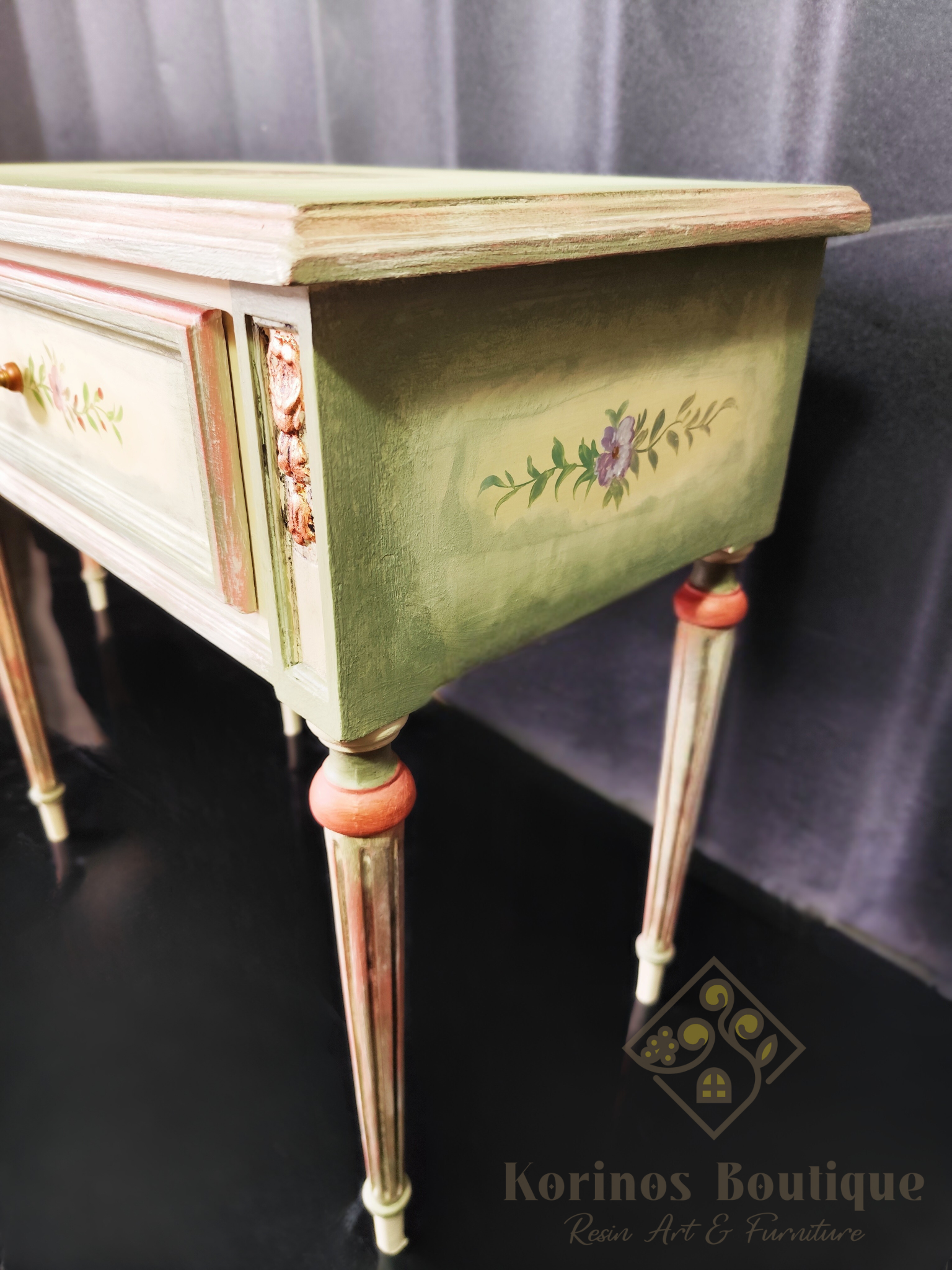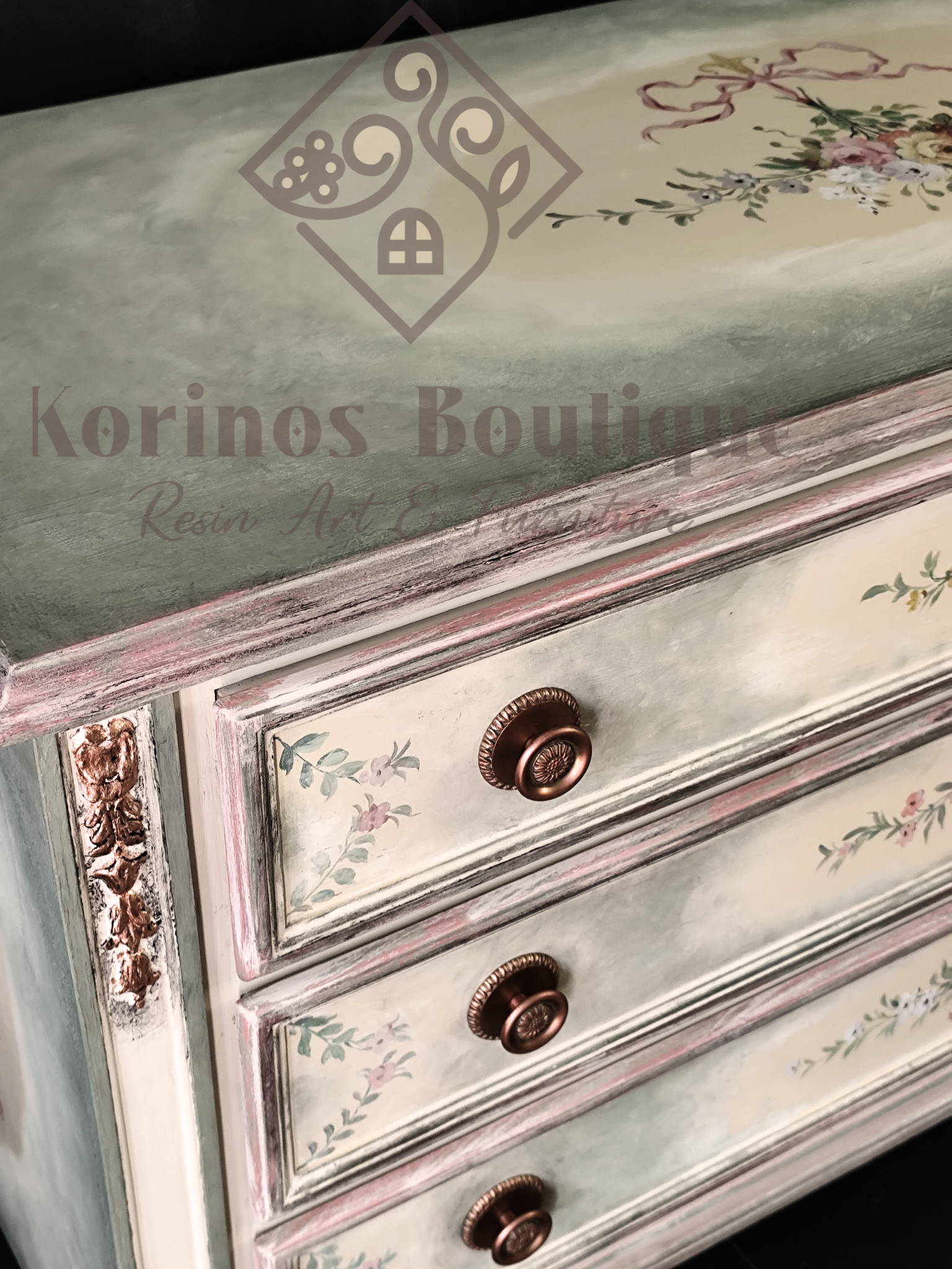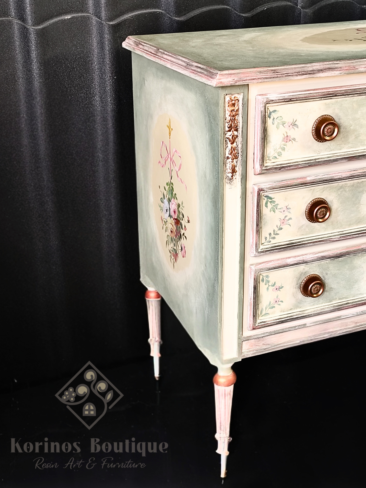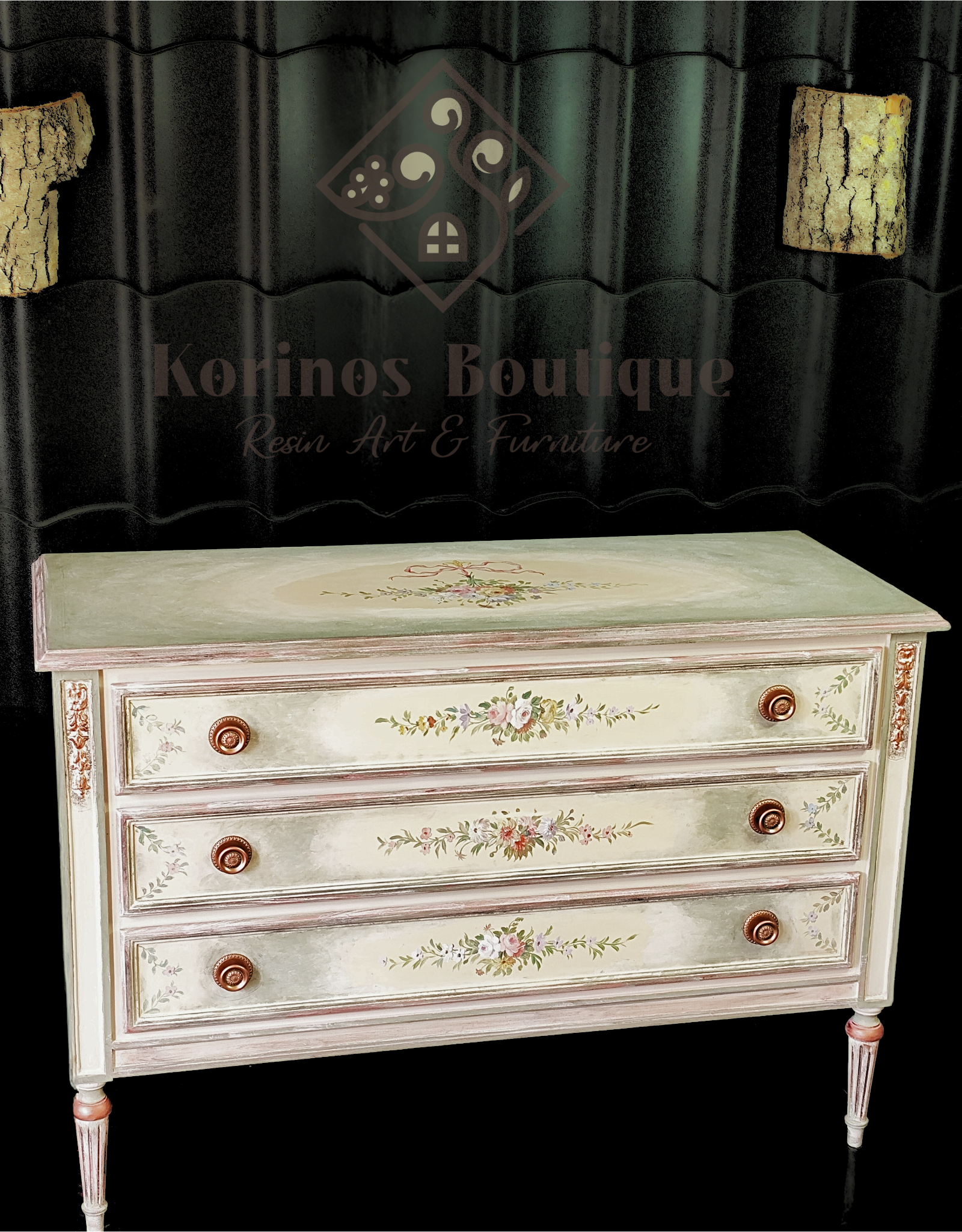 Am păstrat cu respect florile pictate manual, detaliu original care oferă fiecărei piese un farmec aparte și evidențiază măiestria artizanilor italieni. Contrastul subtil între patina modernă a vopselei și delicatețea picturilor originale transformă acest set într-o veritabilă operă de artă funcțională.